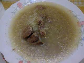 Deitar a água num tacho e deixar ferver. Meter os miudos, o cubo de galinha e os cominhos. Deixar cozinhar. Depois de cozidos deite o arroz e deixe cozer o arroz e está pronto. ![]() ![]() FOTO: fgrs |