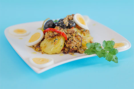 1. Numa panela com água, coloque sal, as batatas bem lavadas e os ovos. Tape e depois de começar a ferver, deixe cozer durante 25 minutos. 2. Passados 10 minutos, retire os ovos para uma tigela com água fria. Deixe cozer as batatas até que fiquem tenrinhas. 3. Depois das batatas cozidas, retire-as com uma escumadeira para uma travessa e deixe arrefecer. 4. Descasque os ovos e passe-os por água para tirar a casca. Com um cortador ou uma faca corte os ovos em rodelas. 5. Quando as batatas já não estiverem muito quentes, retire-lhes a pele. Corte as batatas em rodelas grossas. 6. Entretanto, faça o refogado. Numa frigideira larga, leve ao lume o azeite, a cebola, o pimento, o louro e os alhos. Mexa e deixe refogar muito bem em lume médio até que tudo fique lourinho. Ao refogado junte o atum. Tempere com sal e pimenta preta. Salteie tudo muito bem e caso seja necessário, acrescente mais um pouco de azeite. 7. Adicione a salsa picada e misture bem. Por fim, junte as azeitonas pretas e as rodelas de batatas cozidas. Envolva com cuidado para não partir as batatas e caso seja necessário, separe as rodelas batatas com um garfo. Salteie mais um pouco até que as batatas absorvam os sabores. Sirva com as rodelas de ovo por cima. A equipa do SaborIntenso.com deseja-lhe um bom apetite! Tempo de preparação: 45 minutos ![]()