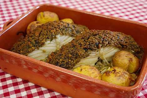 Receita em vídeo de Bacalhau com Crosta de Broa e Azeitonas Ingredientes para 2 a 4 pessoas: