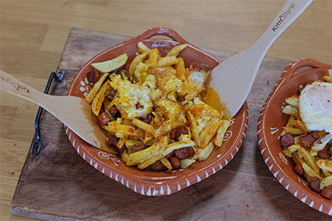 1. Numa fritadeira com o óleo quente, coloque as batatas a fritar. 2. Entretanto, uma frigideira larga, coloque a linguiça de carne, os alhos e o louro. Deixe fritar em lume médio até que fique bem quente. Quando a gordura da linguiça de carne começar a derreter, junte a linguiça de farinheira. Salteie tudo em lume médio até que as linguiças fiquem bem fritas. Quando as linguiças estiverem lourinhas, apague o lume. 3. Entretanto, numa frigideira mais pequena, coloque um pouco de óleo e deixe aquecer. Estrele os ovos, um a um, até que a gema fique mal passada. Depois dos ovos estrelados, retire-os com uma escumadeira para um prato. 4. Quando as batatas estiverem fritas, coloque-as numa travessa com papel absorvente. 5. Em dois pratos individuais de barro, divida as batatas. Tempere as batatas com sal, pimentão doce fumado e pimenta preta. Por cima, coloque metade das linguiças. Com a ajuda de duas colheres de pau, envolva. Retifique os temperos e por cima, espalhe as restantes linguiças. 6. Por fim, divida os ovos pelos pratos. Tempere os ovos com um pouco de sal e pimenta. Na hora de servir, com ajuda das colheres de pau, corte os ovos e pedacinhos e assim espalhando o molho por cima das batatas. A equipa do SaborIntenso.com deseja-lhe um bom apetite! ![]()