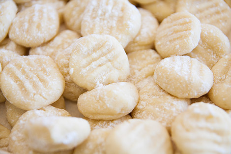 1. Numa panela com água a ferver, tempere com sal. Coloque as batatas a cozer durante 20 minutos. Depois de cozidas, escorra-as. 2. Coloque as batatas num tabuleiro e esmague muito bem com um garfo. Deixe arrefecer durante 5 minutos. 3. Junte a manteiga e os ovos partidos. Tempere com um pouco de sal e pimenta. Misture com um garfo. Aos poucos, junte a farinha e amasse. A massa está pronta quando ficar fofa e leve. 4. Faça bolas pequenas do tamanho do polegar. Acalque as bolinhas com um garfo. Coloque numa travessa polvilhada com farinha. Vá polvilhando o gnocchi com farinha. E estão prontos a utilizar. A equipa do SaborIntenso.com deseja-lhe um bom apetite! Valores Nutricionais: Total: Calorias: 2067 kcal | Lipídios: 22,8g | Hidratos de Carbono: 389g | Proteinas: 63g Por pessoa: Calorias: 295,3 kcal | Lipídios: 3,3g | Hidratos de Carbono: 55,6g | Proteinas: 9g Tempo de preparação: 1 hora Custo total: 1.60 € | Custo por pessoa: 0.23 € ![]()