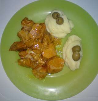 Limpe muito bem a carne e parta-a em pedaços médios. Tempere com sal, os dentes de alho pelados e picados,a pimenta e, a folha de louro. Leve a lume moderado um tacho com o azeite. Quando aquecer, junte a carne e frite ligeiramente. Quando estiver douradinha, acrescente o colorau e mexa. Regue, de seguida, com o vinho branco e um pouco de agua, se necessário. Tape o tacho e, em lume moderado cozinhe até que a carne fique macia. Mexa de vez enquanto. Pouco antes de terminar a cozedura, rectifique o tempero. Sirva a carne acompanhada de puré de batata. Enfeite com azeitonas e salsa picada. ![]() ![]() FOTOS: Monika Bom Apetite! ![]() |