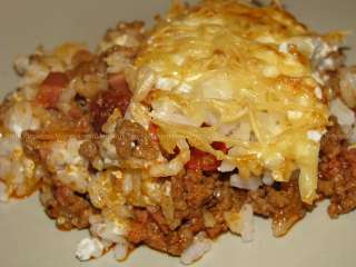 Cozer o arroz em água e sal. Reservar. Refogar a cebola no azeite. Adicionar polpa de tomate a gosto e o pimento, deixar ferver. Adicionar a carne picada, temperada com sal, pimenta, noz moscada. Deixar fritar uns minutos e acrescentar vinho até cobrir a carne. Cozinhar durante 20min. Acrescentar o chouriço, os orégãos, o fiambre e deixar mais 5min. Transferir a carne para uma travessa, cobrir com o arroz e depois com as natas e o queijo ralado, levar ao forno até gratinar. Bom apetite! ![]() FOTO: Tixa |