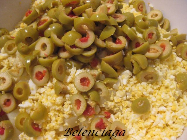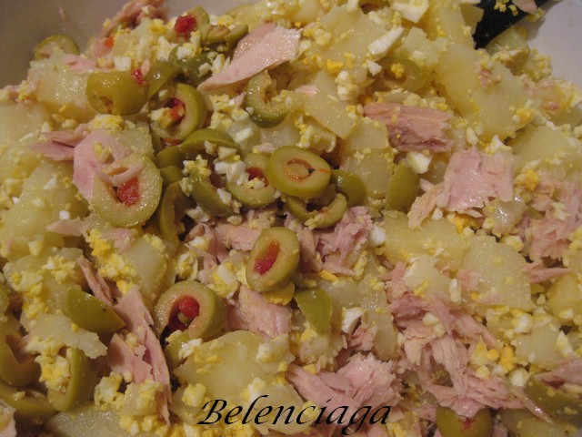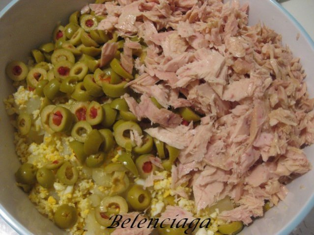 ![]() Descasque as batatas e corte em cubos bem pequenos. Descasque e pique os ovos cozidos (reserve uma gema). Corte as azeitonas recheadas. Desfiar o atum em pedaços pequenos. Em uma tigela grande,junte todos os ingredientes, tempere con sal, adicione a maionese e misture bem. Coloque a salada em um molde redondo (esférico), e desenforme sobre um prato. Cubra com a maionese, espalhe e alise com uma espátula. Polvilhe com gema cozida. Decore com azeitonas pretas e Pringles. Espero que vocês gostem. Bon Appetit!. Receita e fotos: Belenciaga. |