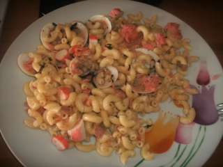 Coza a massa em água temperada com sal e, um fio de azeite. Quando estiver quase cozida, polvilhe generosamente com alho em pó e, misture. Retire quando estiver al-dente, passe por água fria, escorra e, reserve. Num wok, pique os alhos e, regue com azeite. Leve a alourar com as ameijoas até que estas abram. Introduza as fatias de salmão fumado cortadas em tiras e o atum. Tempere com pimenta e coentros em pó a gosto. Incorpore a massa e envolva bem. Por fim, adicione as delícias do mar cortadas em cubos. Pique o manjericão e misture com cuidado. Sirva de imediato. ![]() FOTO: Lua.do.Amanhecer |